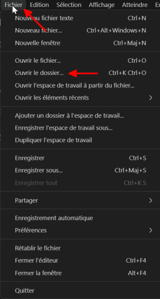 Le premier menu « Fichier » permet de définir le lieu de travail dans lequel nous sauvegarderons les fichiers en cours.